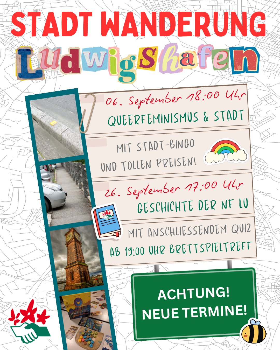 Die Stadtwanderung ist Teil einer Veranstaltungsreihe in Zusammenarbeit mit der Naturfreundejugend RLP und regionalen Bündnispartner*innen: das Stadtarchiv Ludwigshafen – Dr. Klaus J. Becker, Ludwigshafen setzt Stolpersteine .V. – Gerhard Kaufmann und als Künstler aus der Region – Helmut van der Buchholz. 🤝